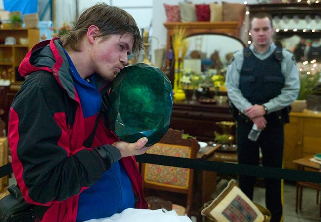 1月26日,在加拿大不列颠哥伦比亚省的基洛纳,人们手捧巨型祖母绿宝石。