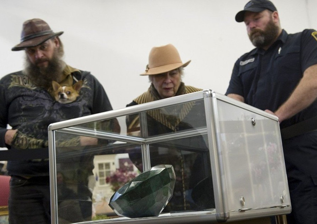 1月26日,在加拿大不列颠哥伦比亚省的基洛纳,人们观看一枚巨型祖母绿宝石。